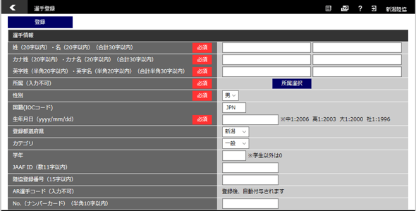 ③新規登録の場合は右上にある「選手登録」をクリックし、左上の「新規選手登録」をクリックすると表示される登録画面(下図)により選手登録を行う。この際、3行目の英字姓名(ヘボン式)の入力を必ず行うこと。生年月日は2001/1/1のように入れる。