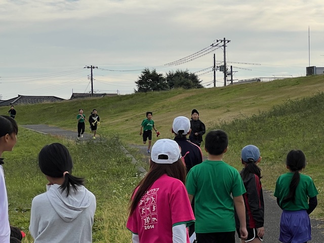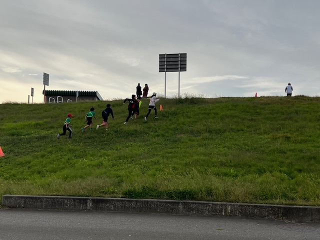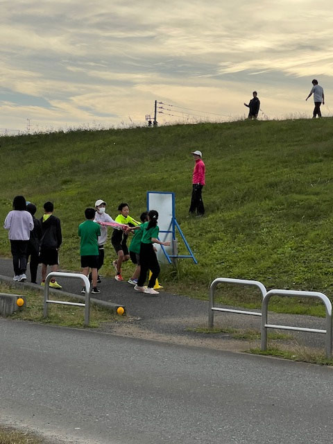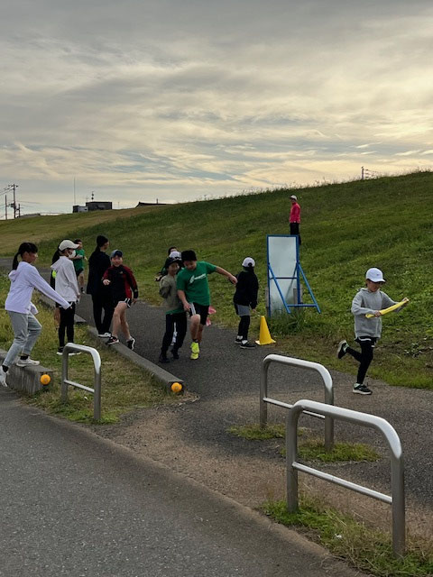競技場が改修のため閉場のため自由広場と堤防を使用しての教室となりました。不整地やアップダウンありとトラックでは経験できないなかでの動き作り、最後にはミニミニ駅伝で締めくくりました。今後もお天気になれば堤防での活動も考えております。